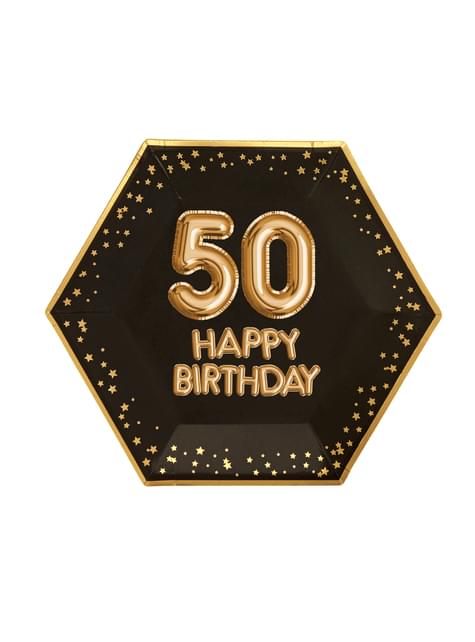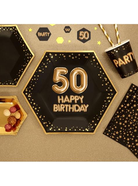 8 "50 õnneliku sünnipäeva" kuuskantpaberiga plaatide komplekt - Glitz & Glamour Black & Gold